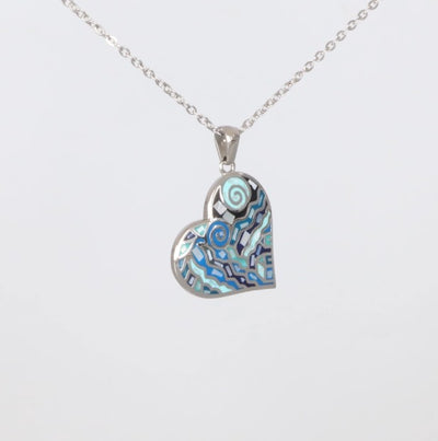 Silberfarbene Halskette mit herzförmigem Anhänger und kunstvollem Mosaikmuster in Blau- und Türkistönen von Crystalp