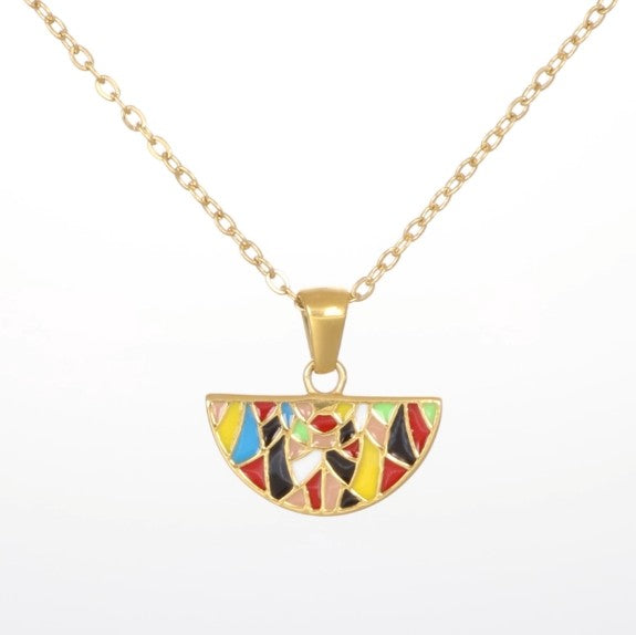 Crystalp Halskette mit halbrundem Anhänger im bunten Mosaikdesign, eingefasst in goldfarbener Fassung.