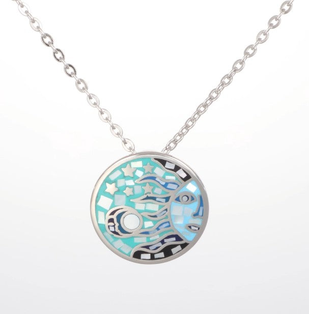 Runde Halskette von Crystalp mit filigranem Einlege-Muster in Blau- und Grüntönen, das eine abstrakte Sternen- und Himmelslandschaft darstellt, eingefasst in glänzendem Silber.