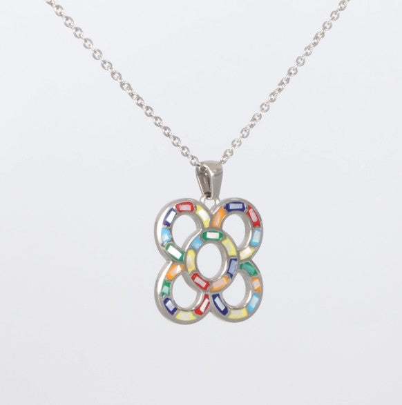 Silberfarbene Halskette mit halbrundem Anhänger und buntem Mosaikmuster in Pink-, Rot-, Blau- und Grüntönen von Crystalp