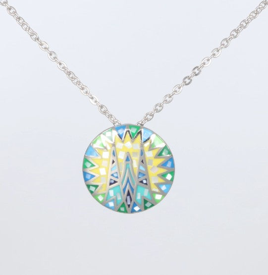 Silberfarbene Halskette mit rundem Anhänger im bunten geometrischen Muster in Gelb-, Blau- und Grüntönen von Crystalp