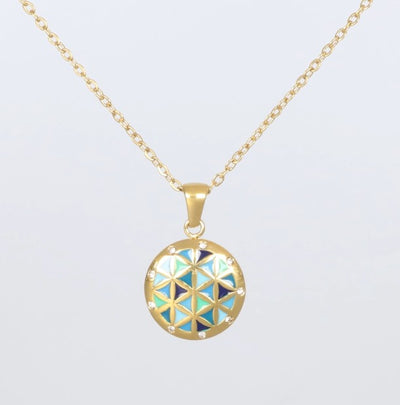 Das Al Andalus Small Pendant vereint filigrane Eleganz mit kultureller Inspiration. Der runde Anhänger zeigt ein feines Mosaik in Blau- und Grüntönen, eingefasst von funkelnden Kristallen, die dem Design eine edle Ausstrahlung verleihen.