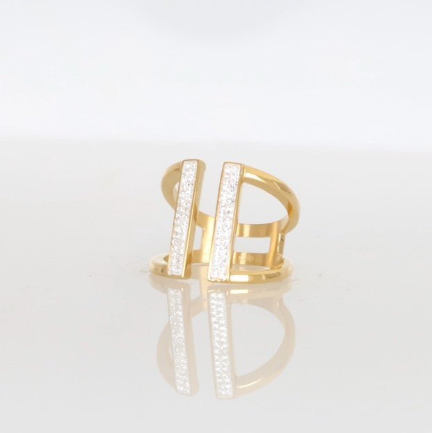 Goldener Ring mit klaren Swarovski® Kristallen in zwei vertikalen Linien. Offenes, modernes Design als elegantes Statement-Piece.
