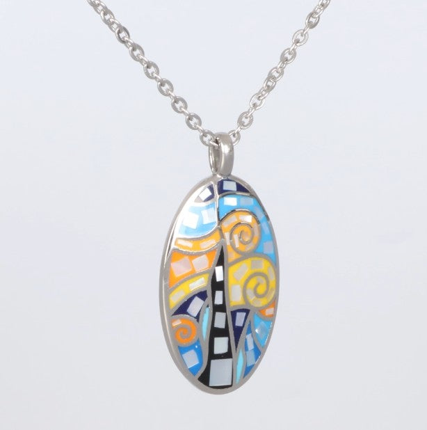 Silberner Edelstahl Anhänger oval mit Mosaik in Blau Gelb Orange inspiriert von Sternennacht kunstvoll und modern