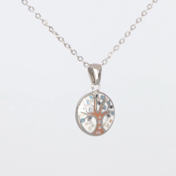 Das Tree of Life Small Pendant ist ein zeitloses Symbol für Wachstum, Stärke und Harmonie. Der runde Anhänger aus glänzendem Edelstahl zeigt einen kunstvoll gestalteten Lebensbaum mit dezenten Mosaik-Details in Perlmutt- und Blautönen.