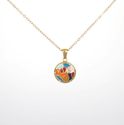 Der kleine, runde Anhänger zeichnet sich durch ein farbenfrohes, abstraktes Design aus, das an ein kunstvolles Fenster erinnert. Perfekt für den täglichen Gebrauch oder besondere Anlässe, fügt er jedem Outfit einen Hauch von Kunst und Raffinesse hinzu.